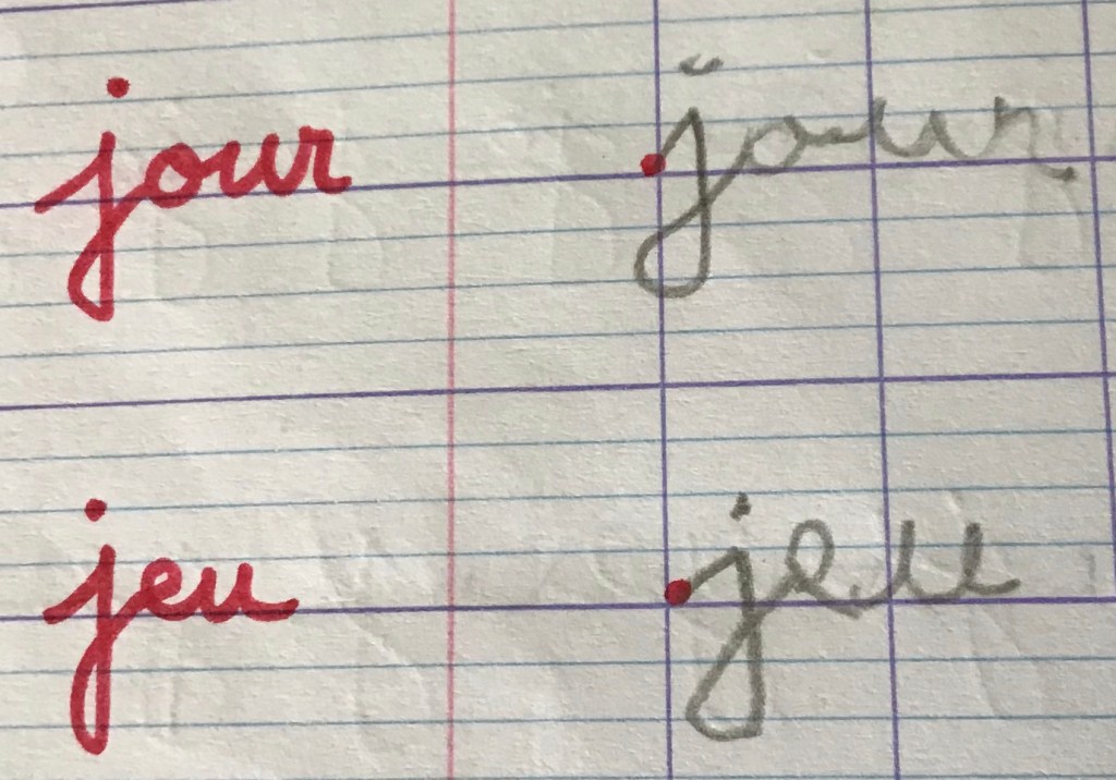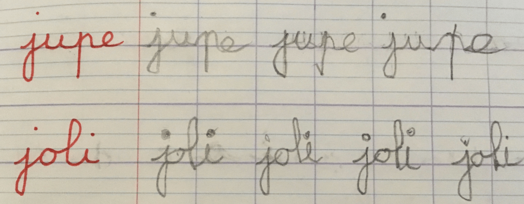 On peut voir sur cette photo que l’enseignant propose deux modèles de « j » différents. L’élève qui faisait ses « j » uniformément la veille (photo précédente) avec un autre enseignant adapte son tracé à celui du modèle.