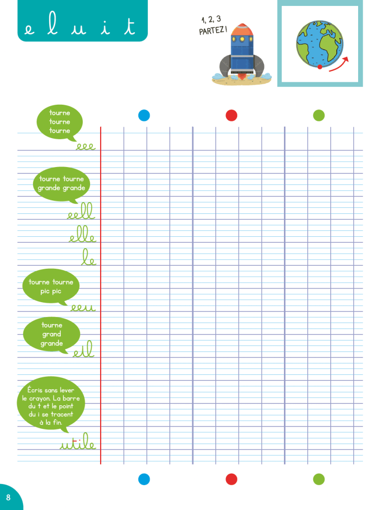 Dans les premières pages, des colonnes marquées d’un point bleu • , vert • et rouge • sont un guide de placement du bras. Quand l’élève, droitier comme gaucher, écrit dans la colonne bleue, son avant-bras doit cacher le point bleu en bas de la colonne. Il doit pour cela, orienter convenablement le cahier.