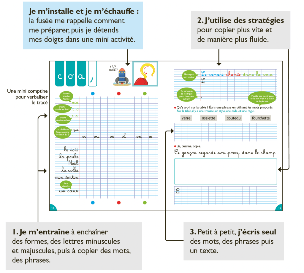 Pour aider l’élève à améliorer son écriture, un travail de mobilité des doigts est proposé tout au long du cahier pour permettre une appropriation de la tenue de crayon adéquate et mobiliser les doigts.