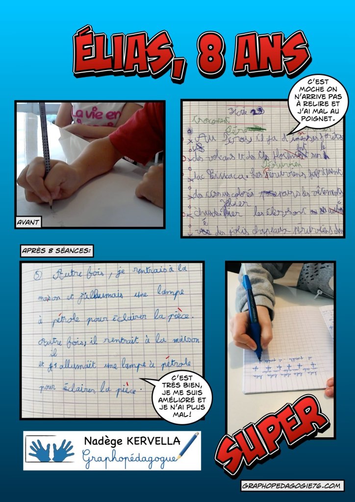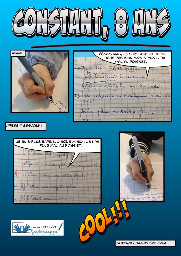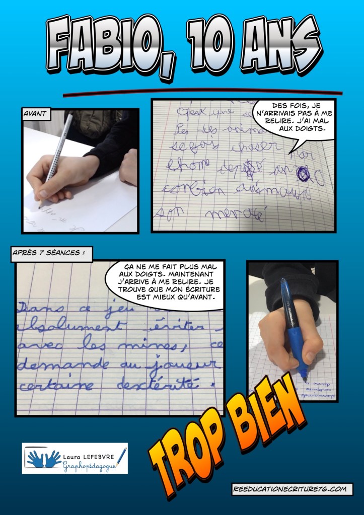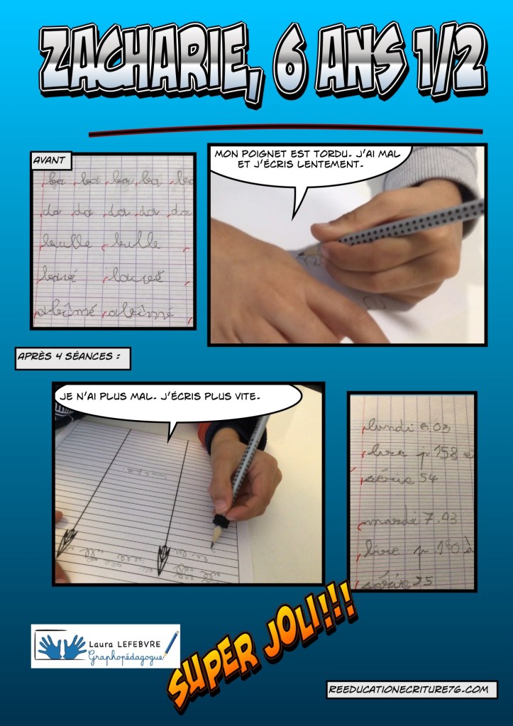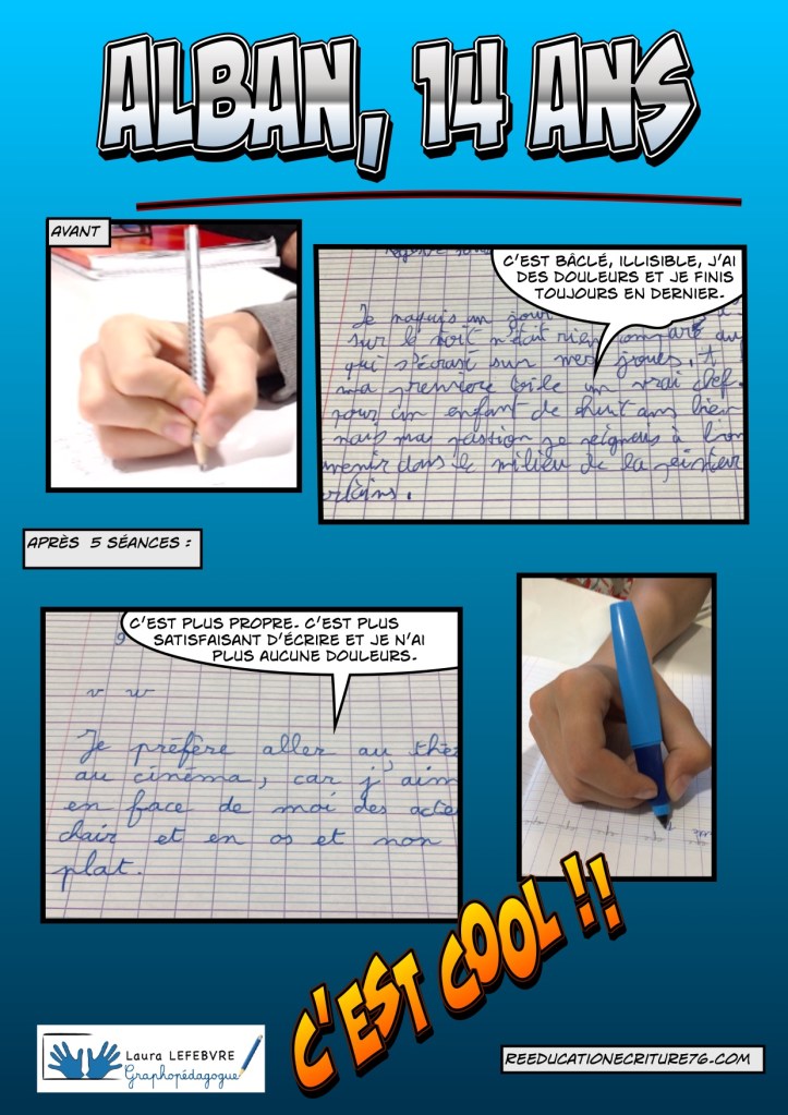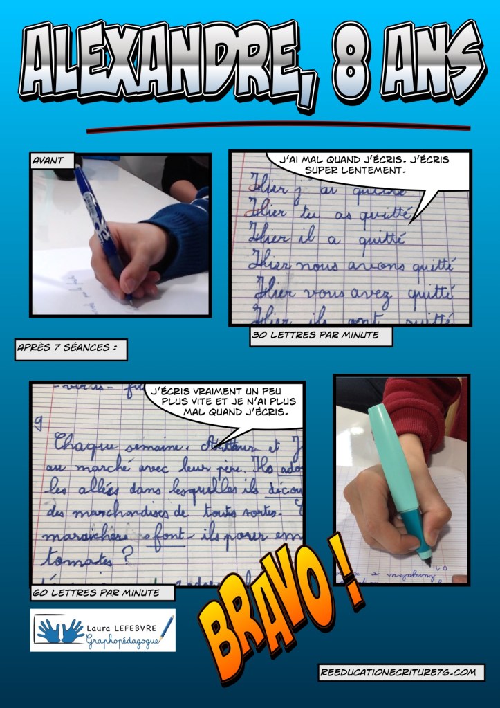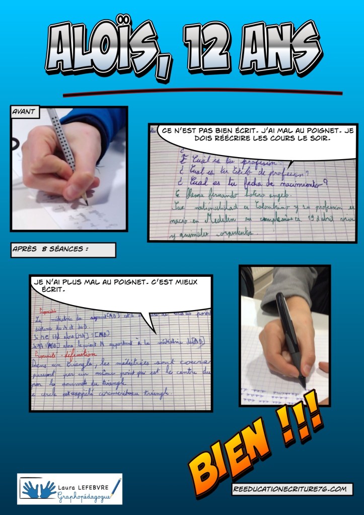 Bravo Adrien pour ce beau travail ! Plus de douleurs au poignet, une meilleure fluidité et une écriture plus lisible. Je suis fière de toi !