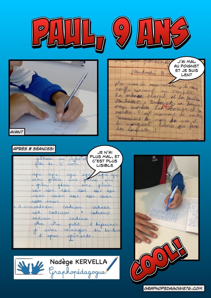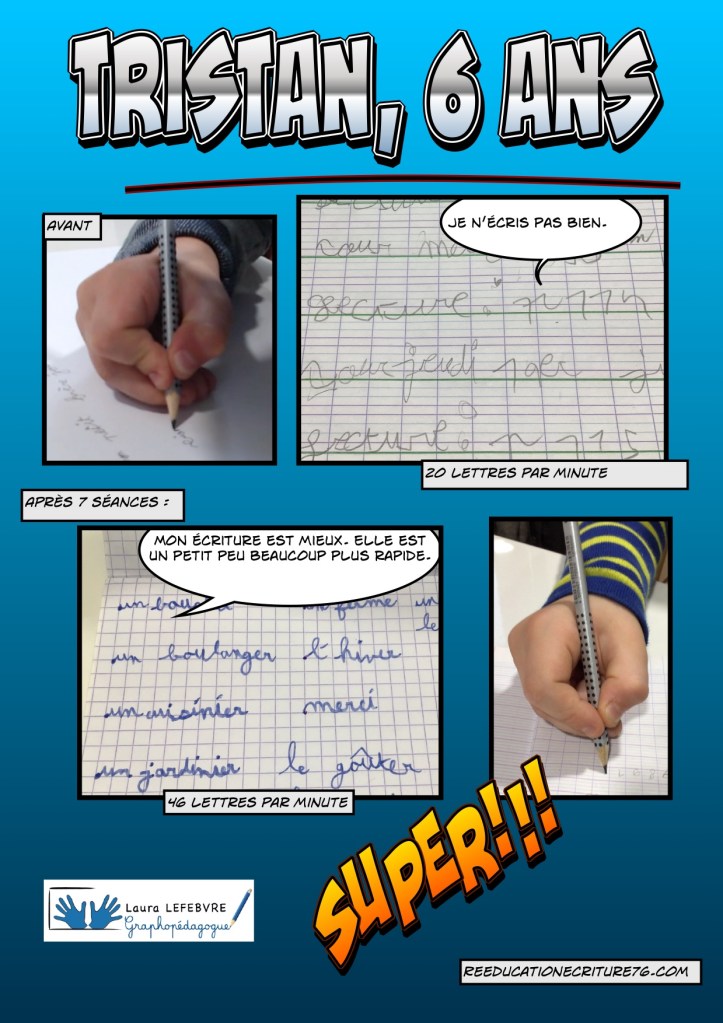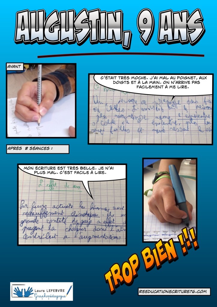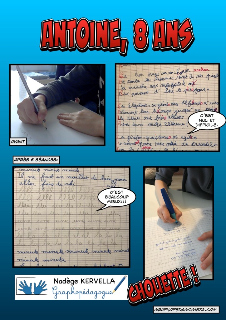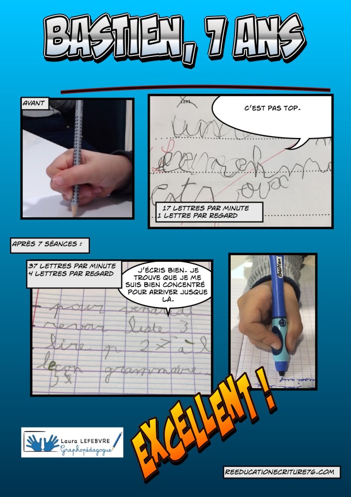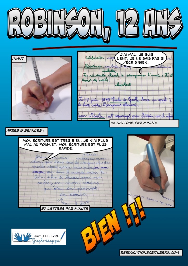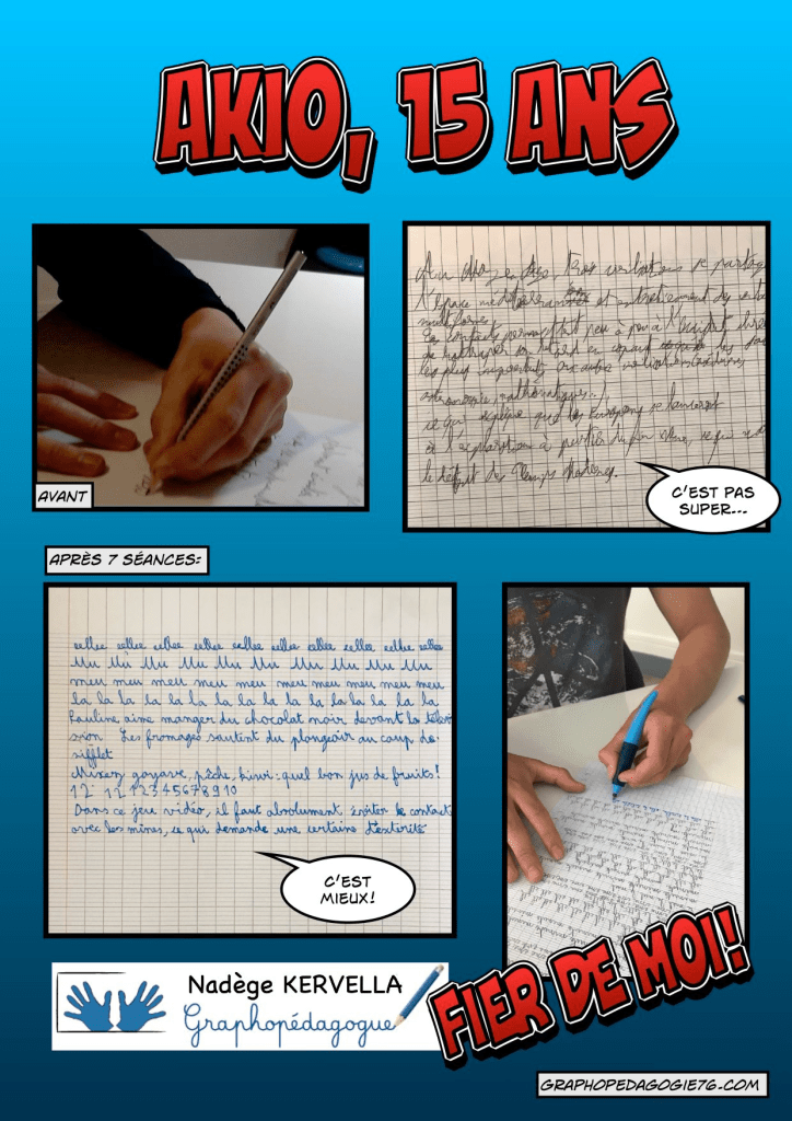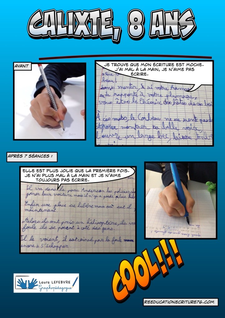 Bravo Adrien pour ce beau travail ! Plus de douleurs au poignet, une meilleure fluidité et une écriture plus lisible. Je suis fière de toi !