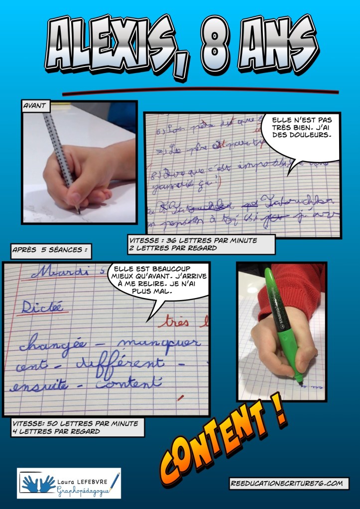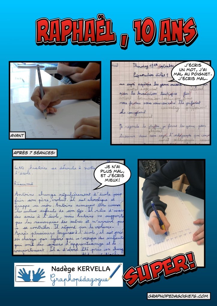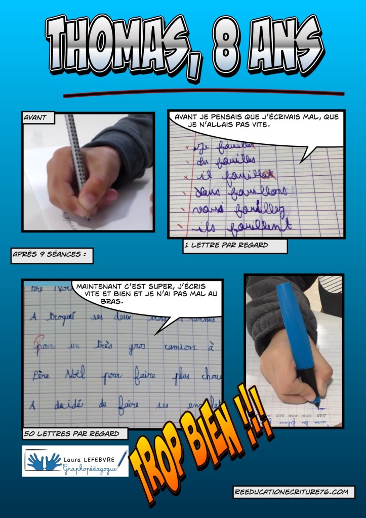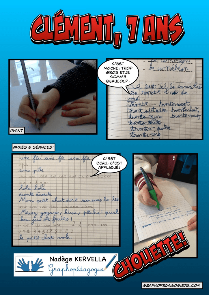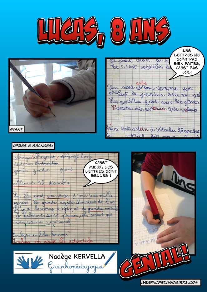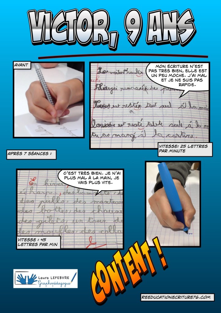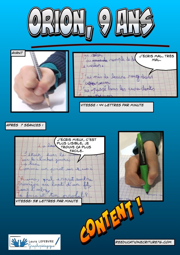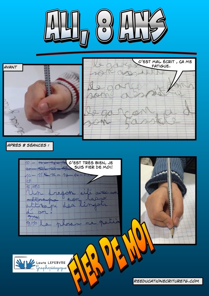 Bravo Adrien pour ce beau travail ! Plus de douleurs au poignet, une meilleure fluidité et une écriture plus lisible. Je suis fière de toi !