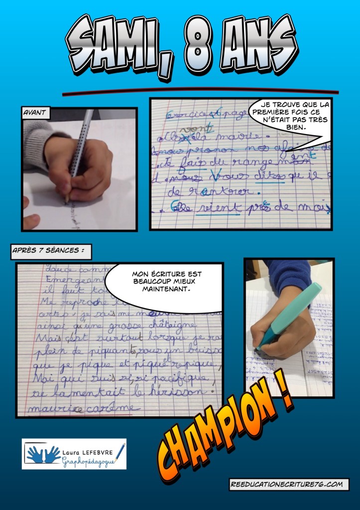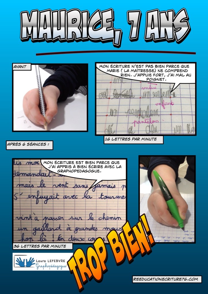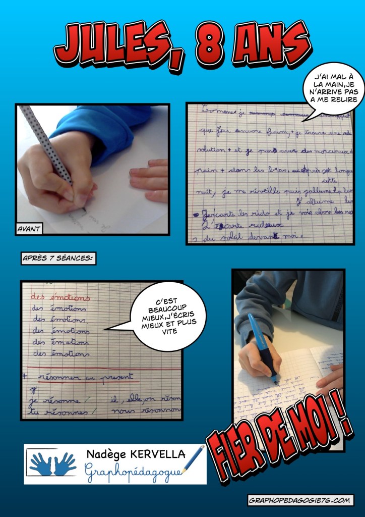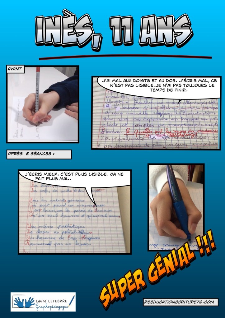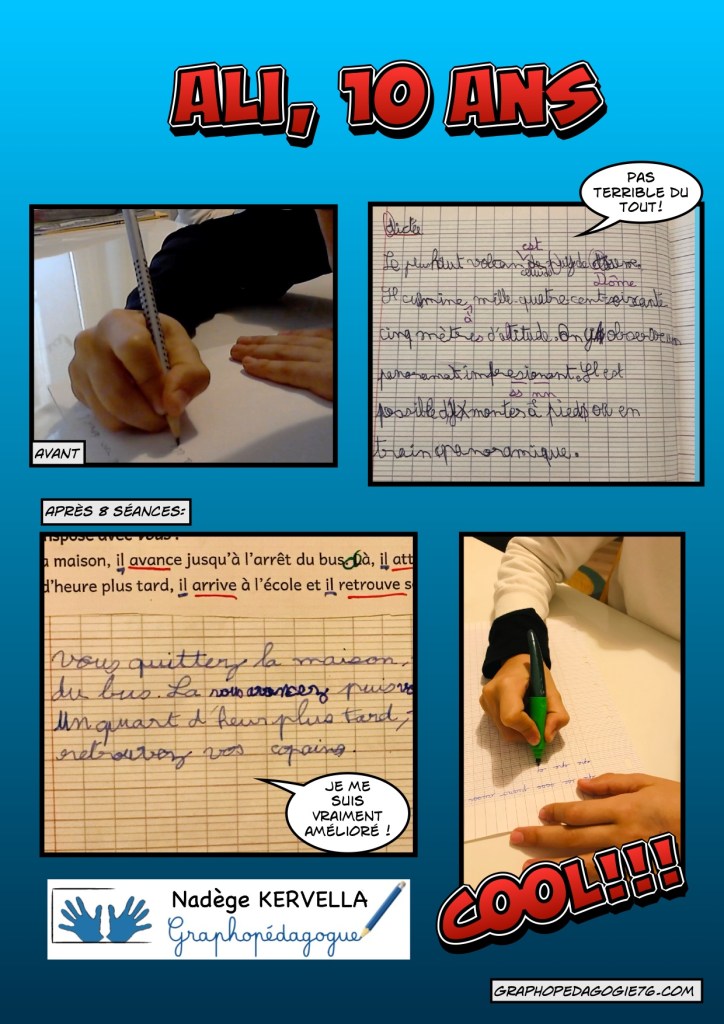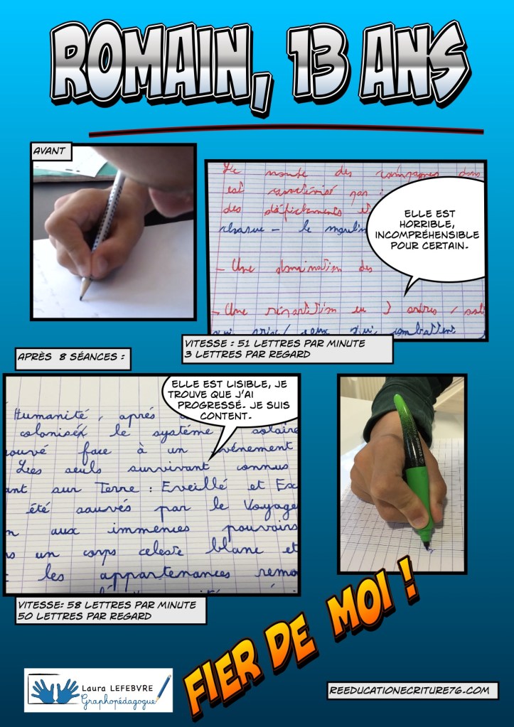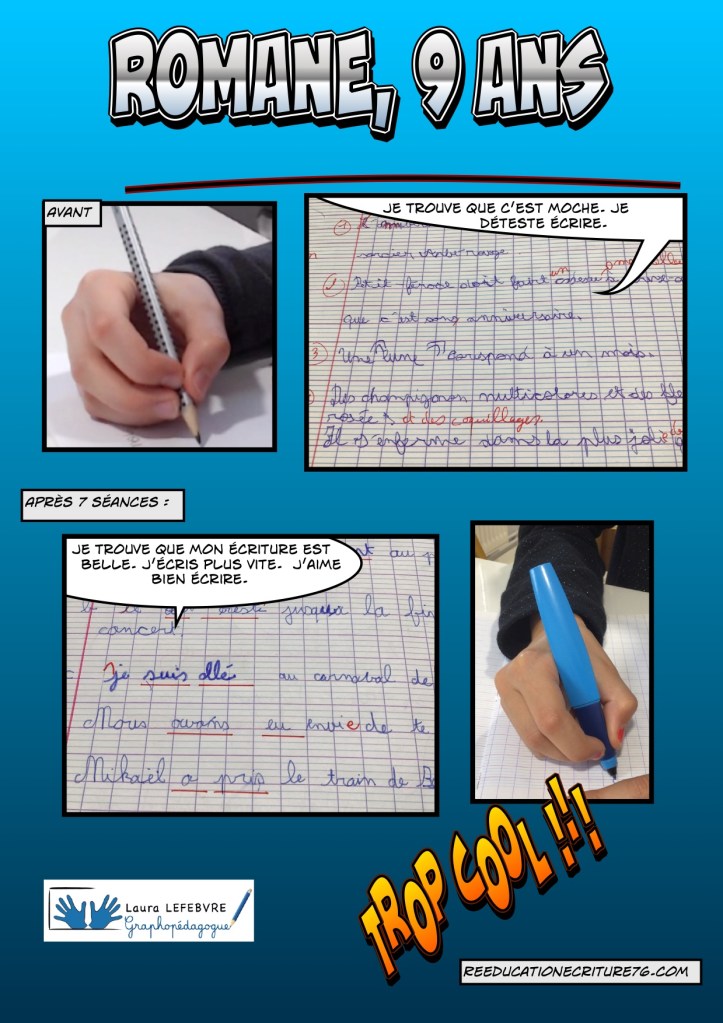 Bravo Adrien pour ce beau travail ! Plus de douleurs au poignet, une meilleure fluidité et une écriture plus lisible. Je suis fière de toi !