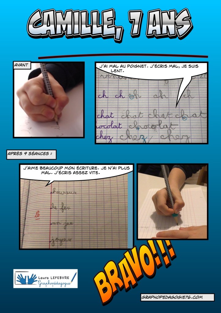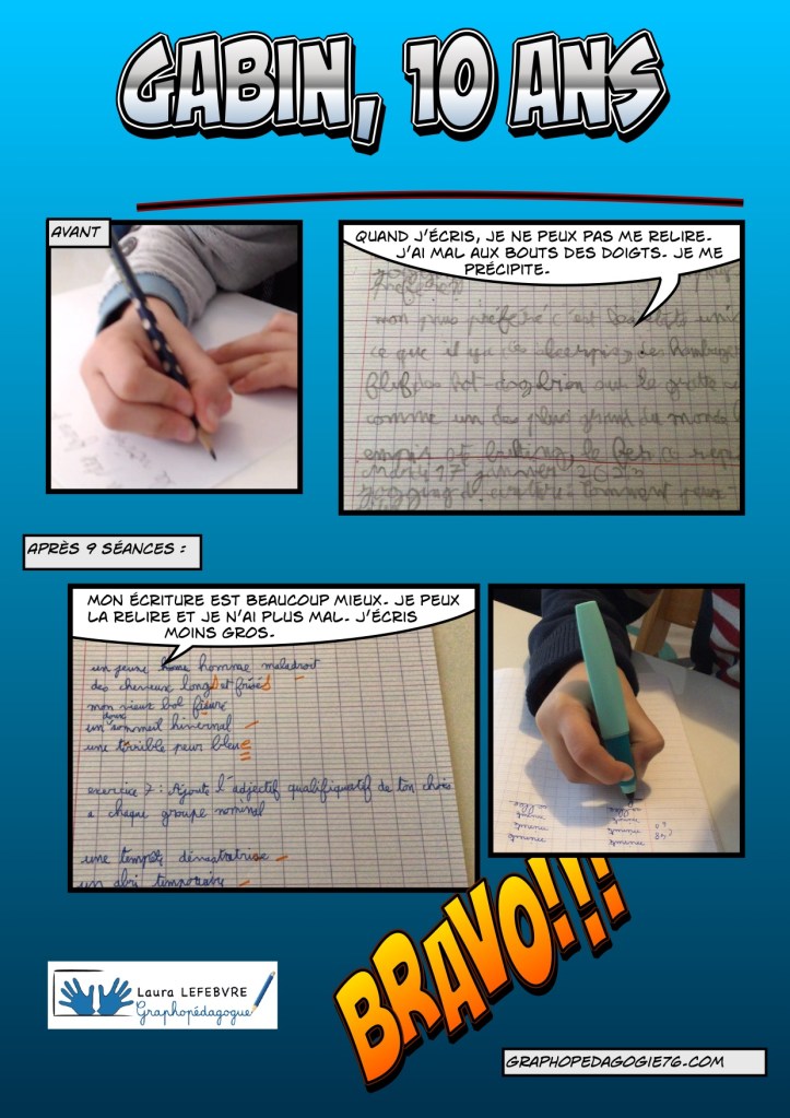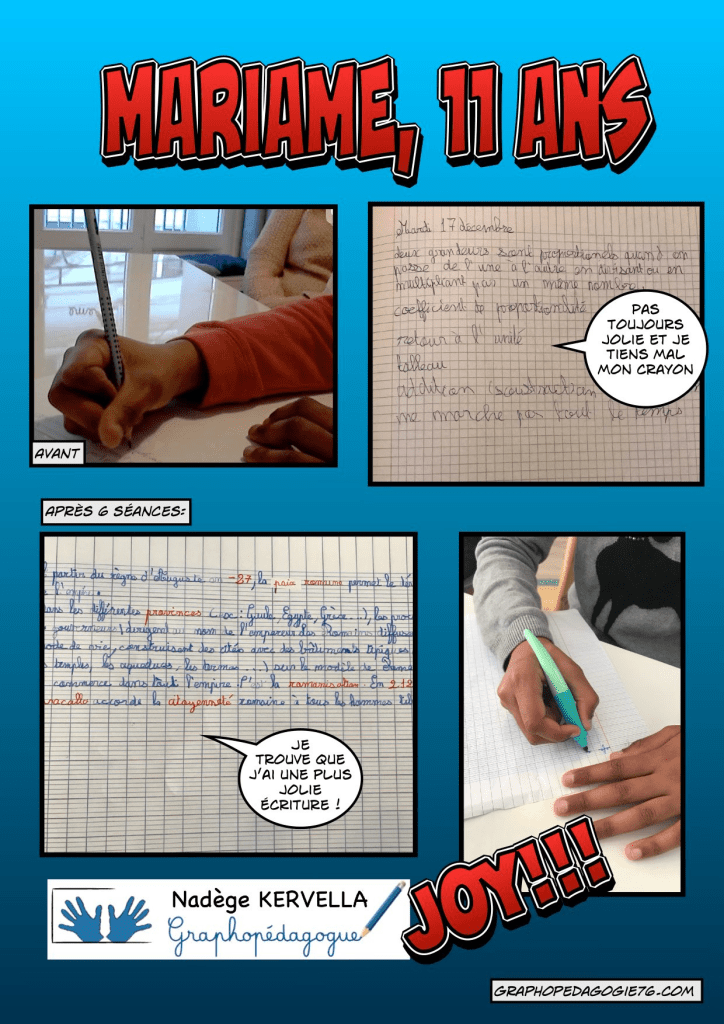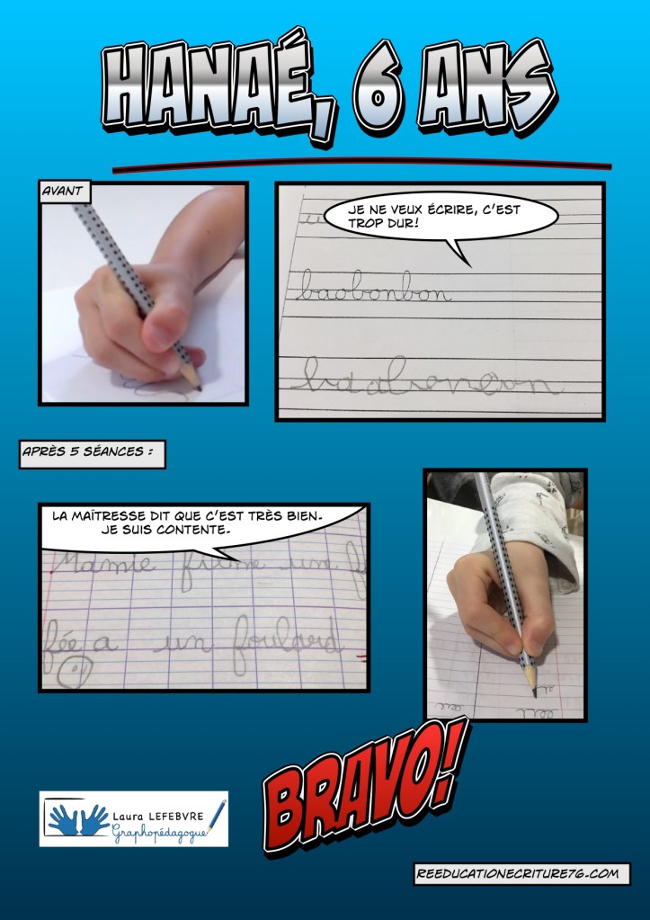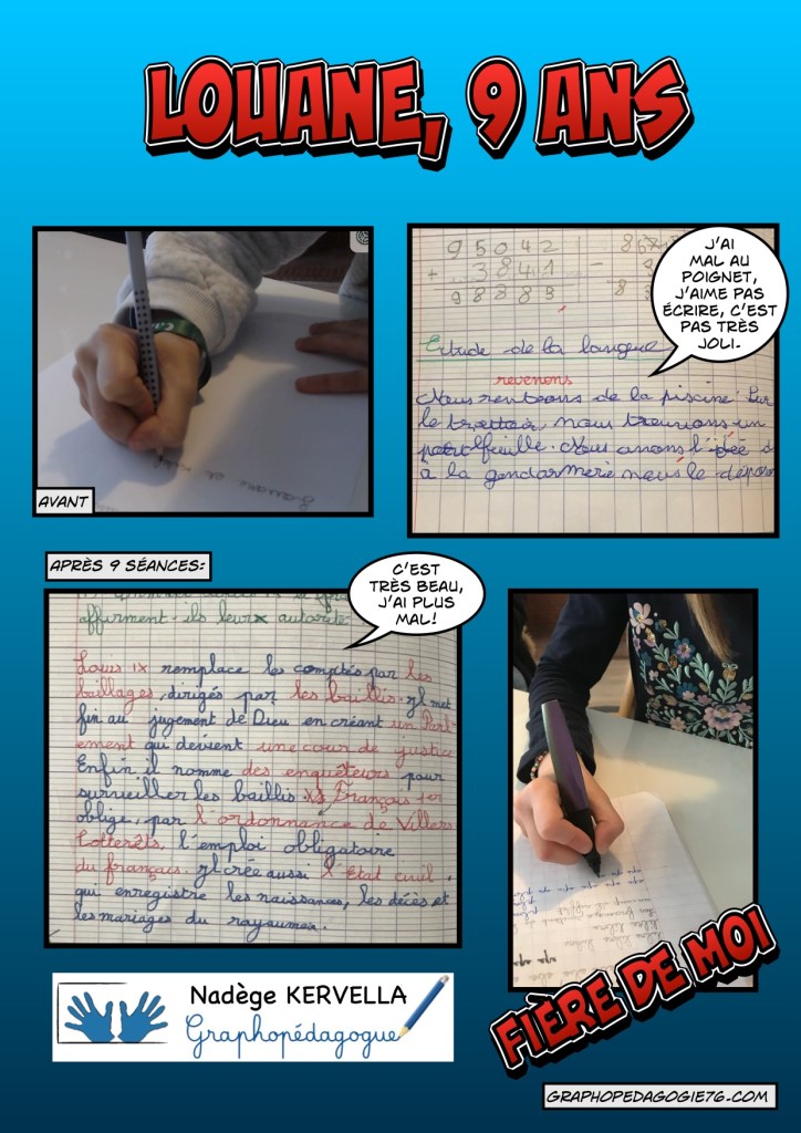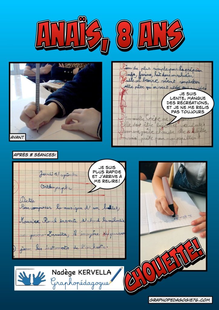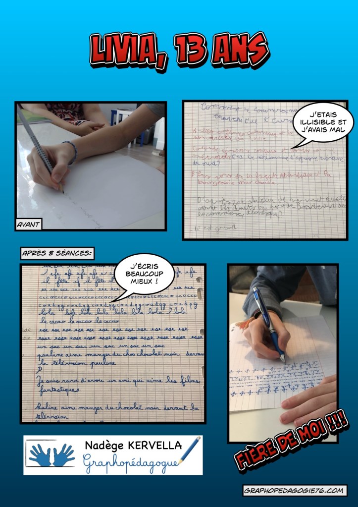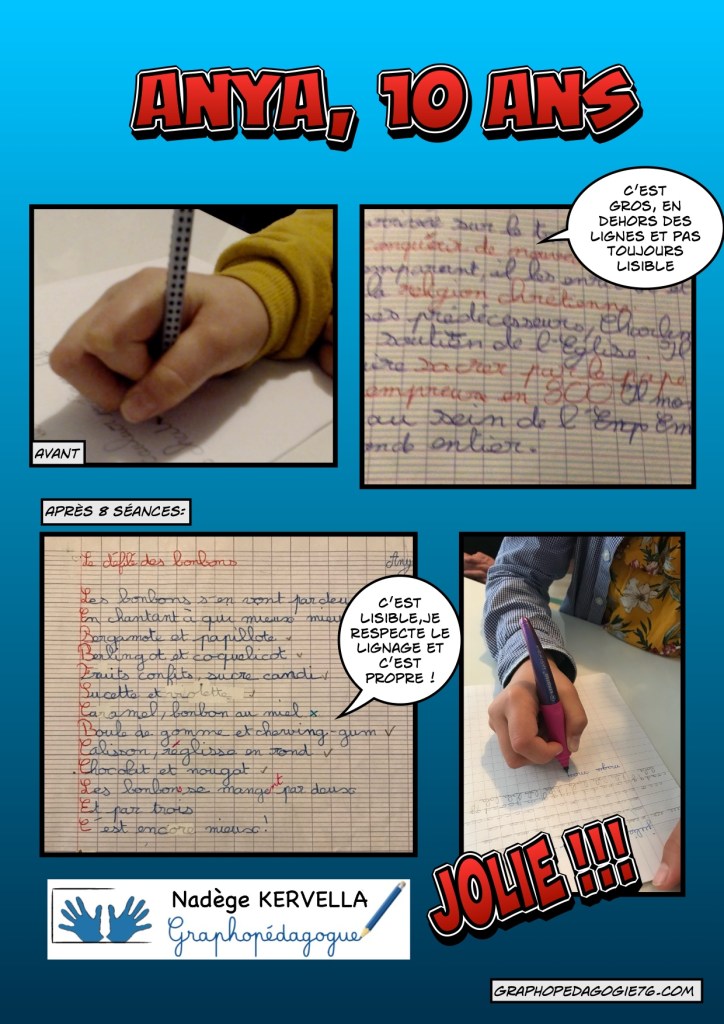 « J’écris mal, je suis lente et c’est souvent illisible », voici les mots d’Anaïs lors de notre rencontre au cabinet. Aujourd’hui, je te félicite, tu peux être fière de toi ! Tu mérites ces beaux changements et je te souhaite une excellente continuation. Merci pour ta bonne humeur et ton sourire.