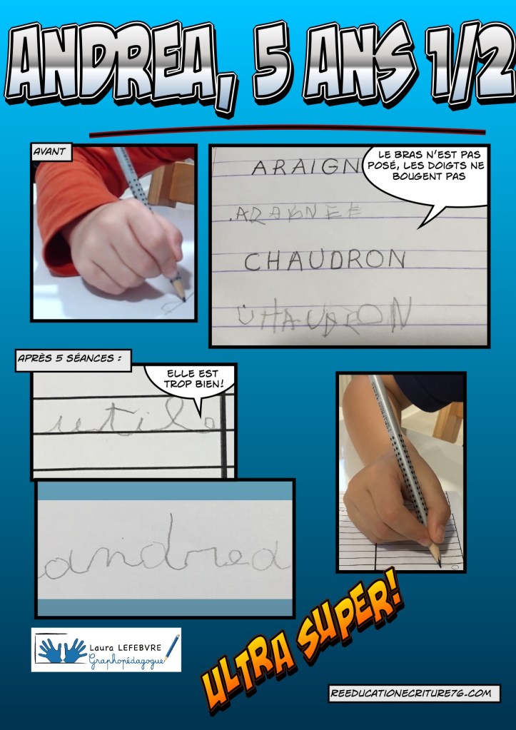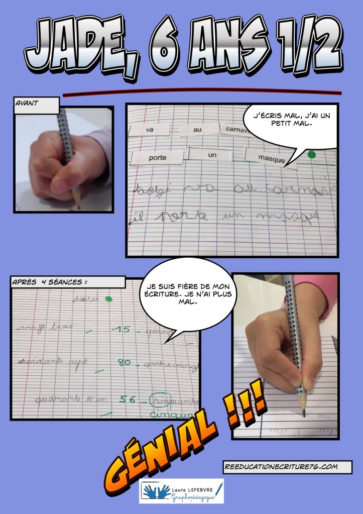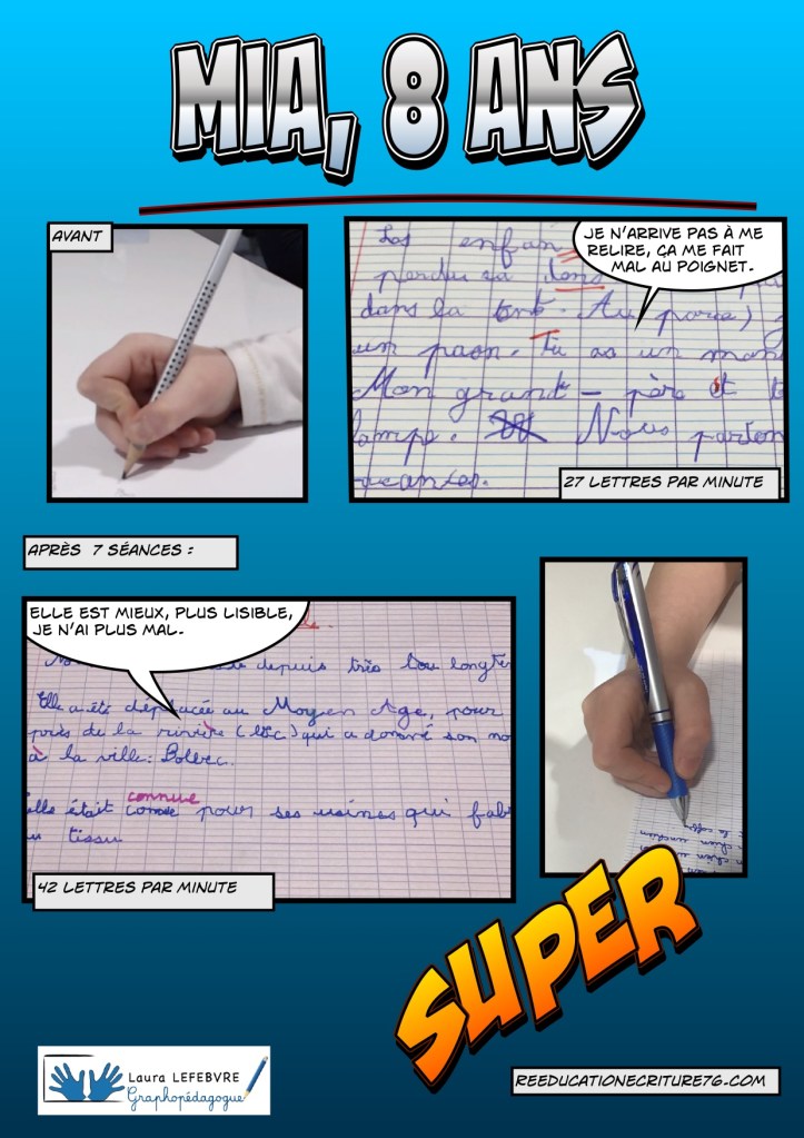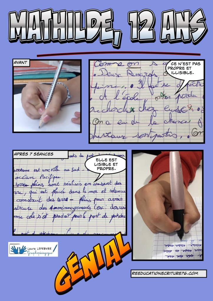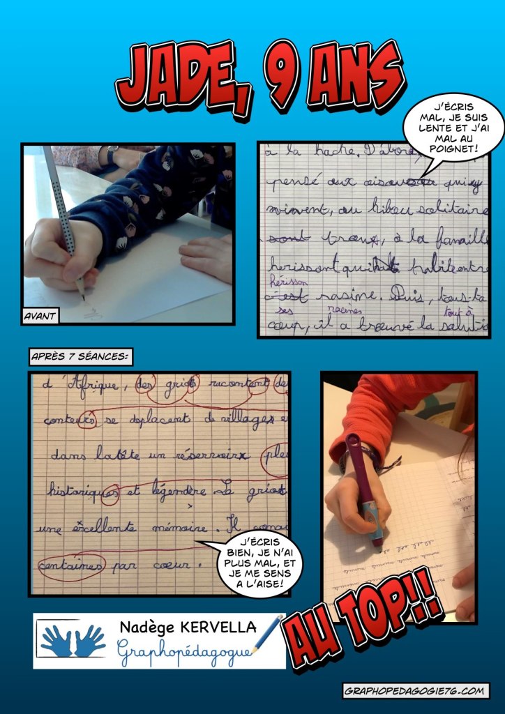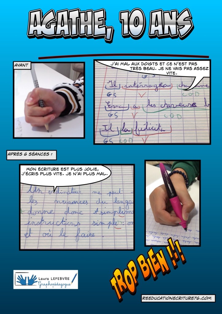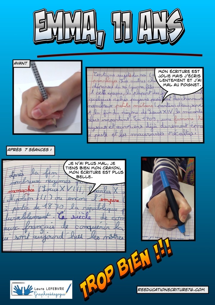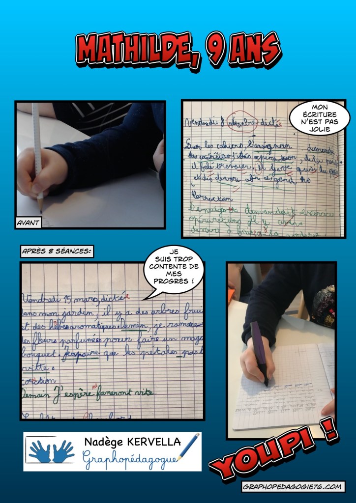 « J’écris mal, je suis lente et c’est souvent illisible », voici les mots d’Anaïs lors de notre rencontre au cabinet. Aujourd’hui, je te félicite, tu peux être fière de toi ! Tu mérites ces beaux changements et je te souhaite une excellente continuation. Merci pour ta bonne humeur et ton sourire.