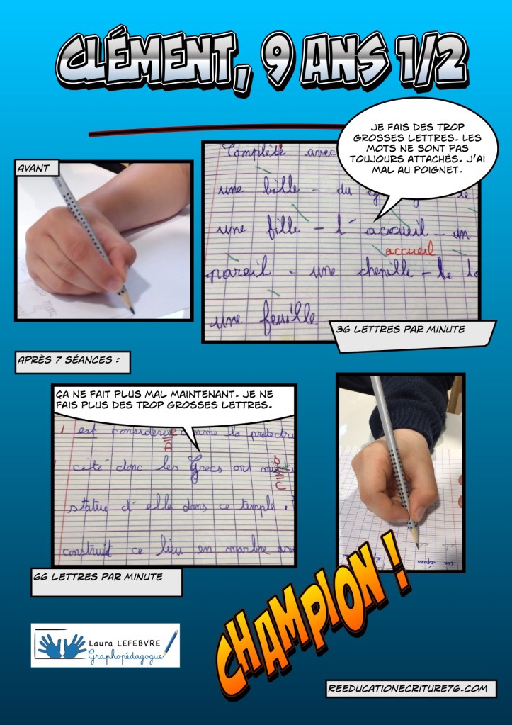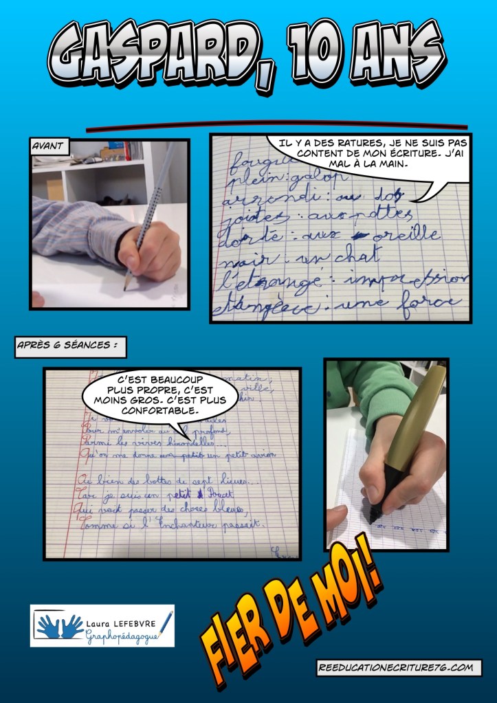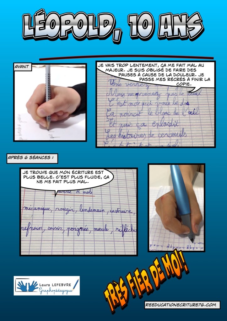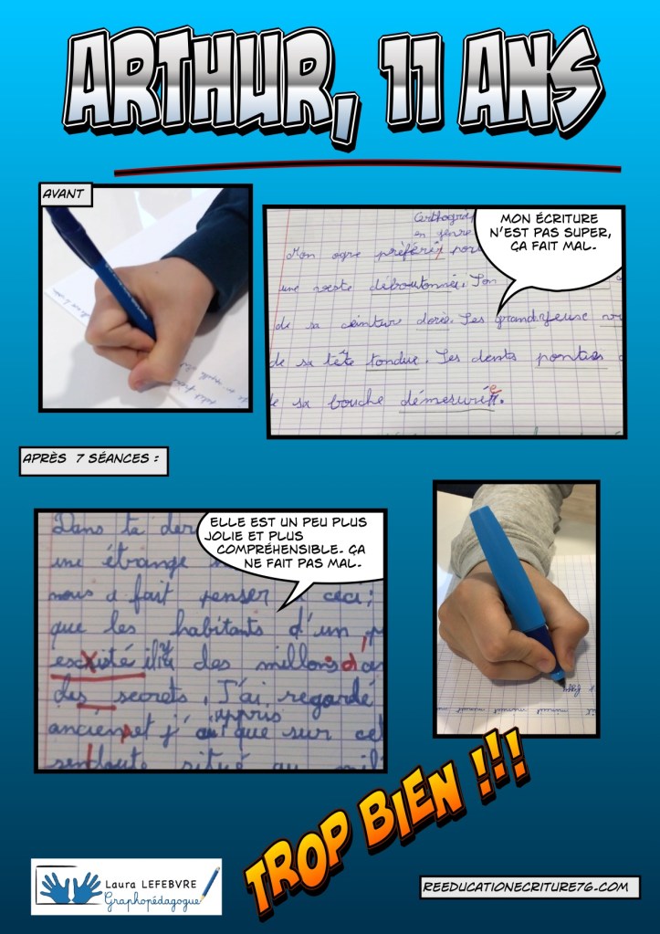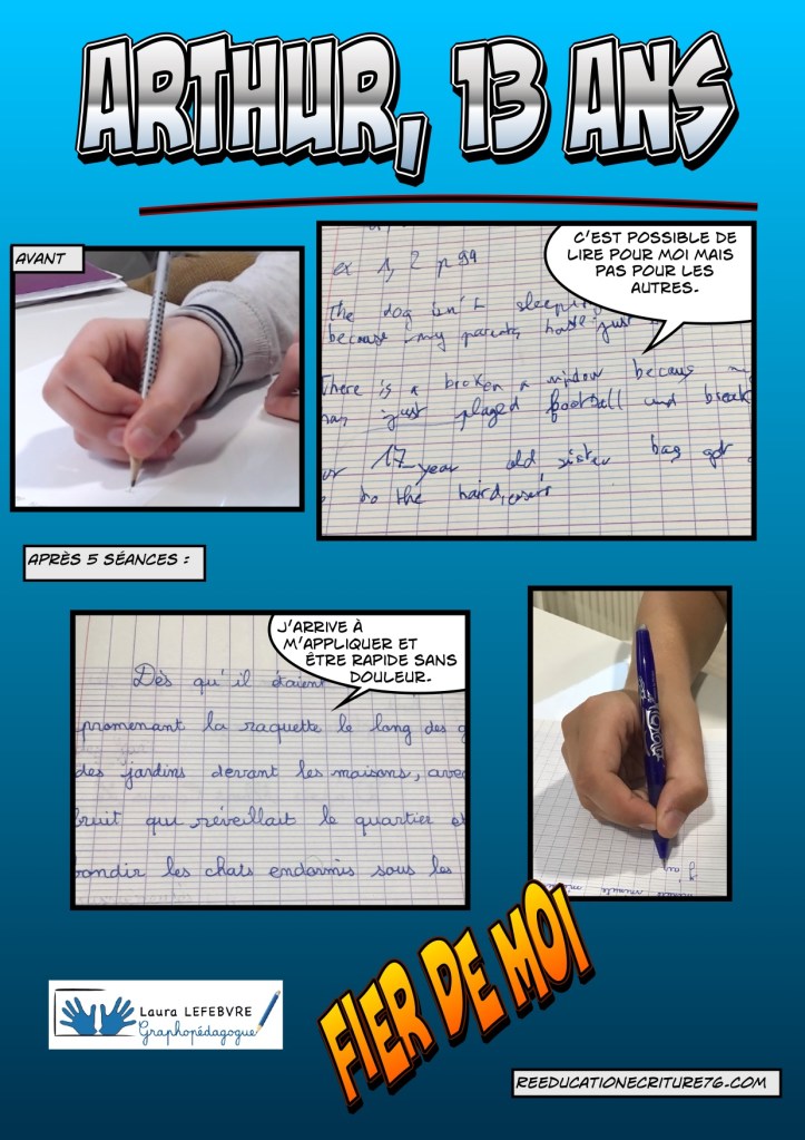 Arthur a eu aujourd’hui sa dernière séance de rééducation de l’écriture. Il sait quels sont les points qui lui restent à améliorer mais il peut être fier de ce spectaculaire changement de posture. Sa nouvelle position lui permet une écriture bien plus efficace, fluide et surtout sans douleur. Bonne continuation Arthur!