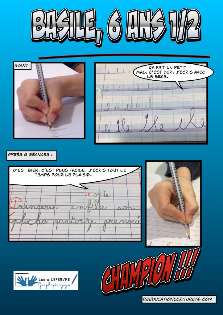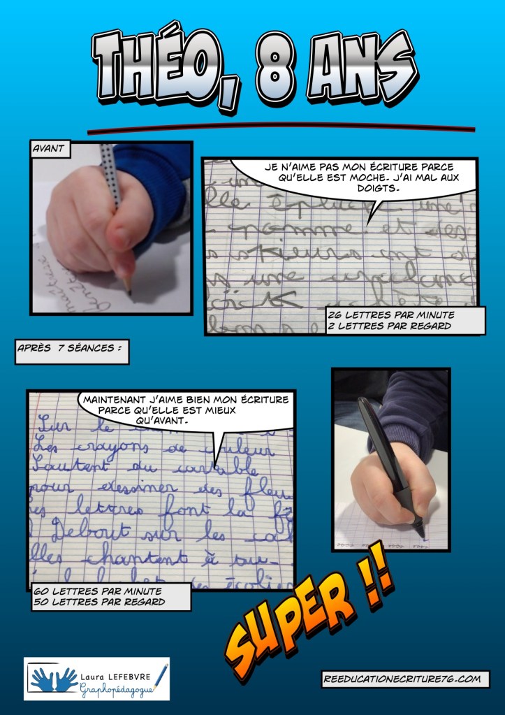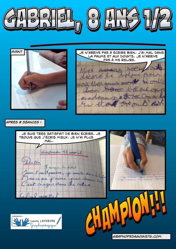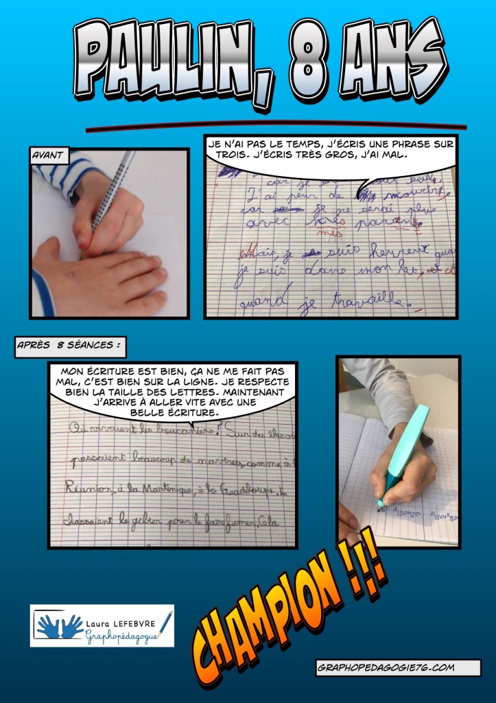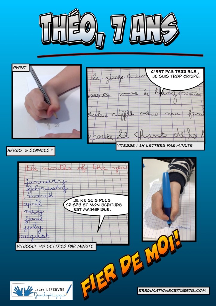 Arthur a eu aujourd’hui sa dernière séance de rééducation de l’écriture. Il sait quels sont les points qui lui restent à améliorer mais il peut être fier de ce spectaculaire changement de posture. Sa nouvelle position lui permet une écriture bien plus efficace, fluide et surtout sans douleur. Bonne continuation Arthur!