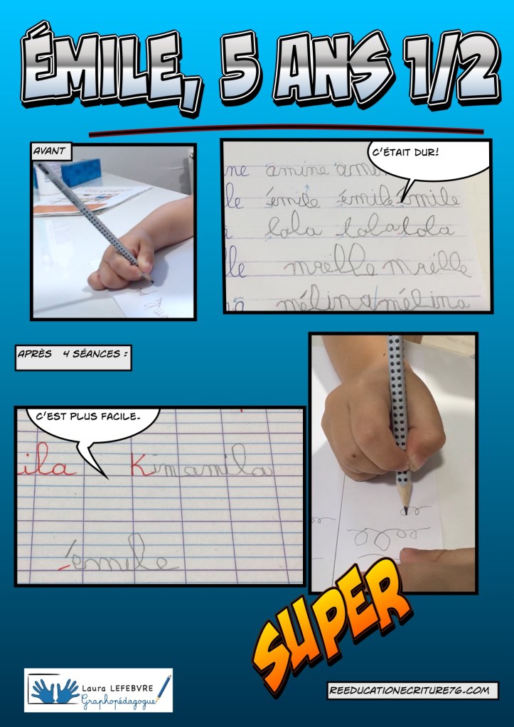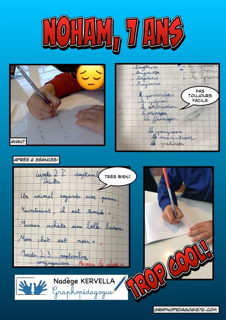 Bravo Noham, en seulement 6 séances tu as changé ta tenue de crayon, ta posture, pour une meilleure fluidité et rapidité, c’était un plaisir de travailler avec toi. Merci pour ta bonne humeur et ton envie de bien faire !