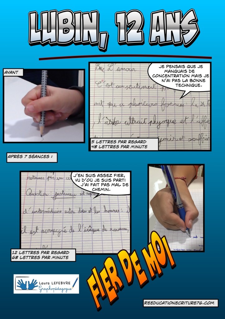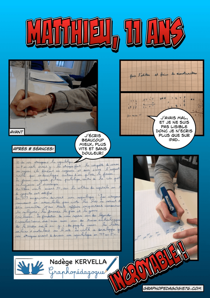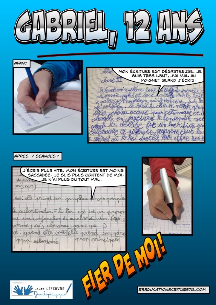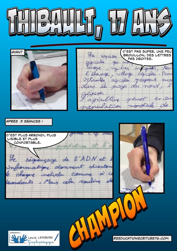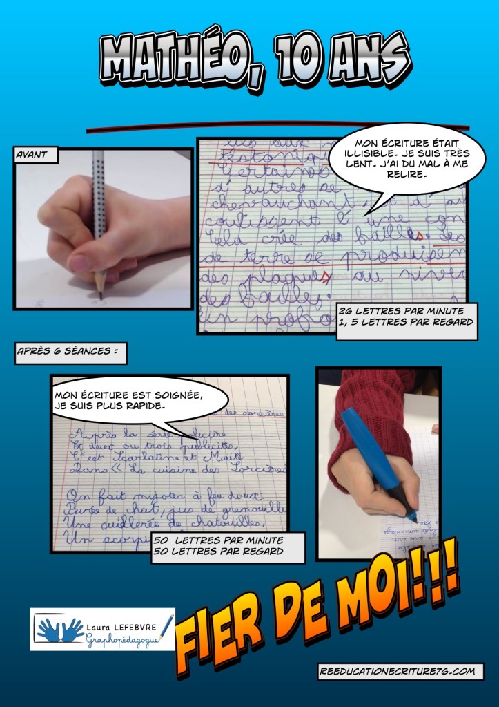 Quand Matthieu est venu au cabinet, il n’écrivait plus du tout en cours et n’utilisait que sa tablette. Pour lui, écrire était synonyme de lenteur, douleurs au poignet et être illisible. Grâce à son courage, sa bonne volonté, Matthieu a pu se prouver qu’à force de persévérance tout reste possible ! Toutes mes félicitations et garde en tête tous les conseils pour continuer à croire en toi !