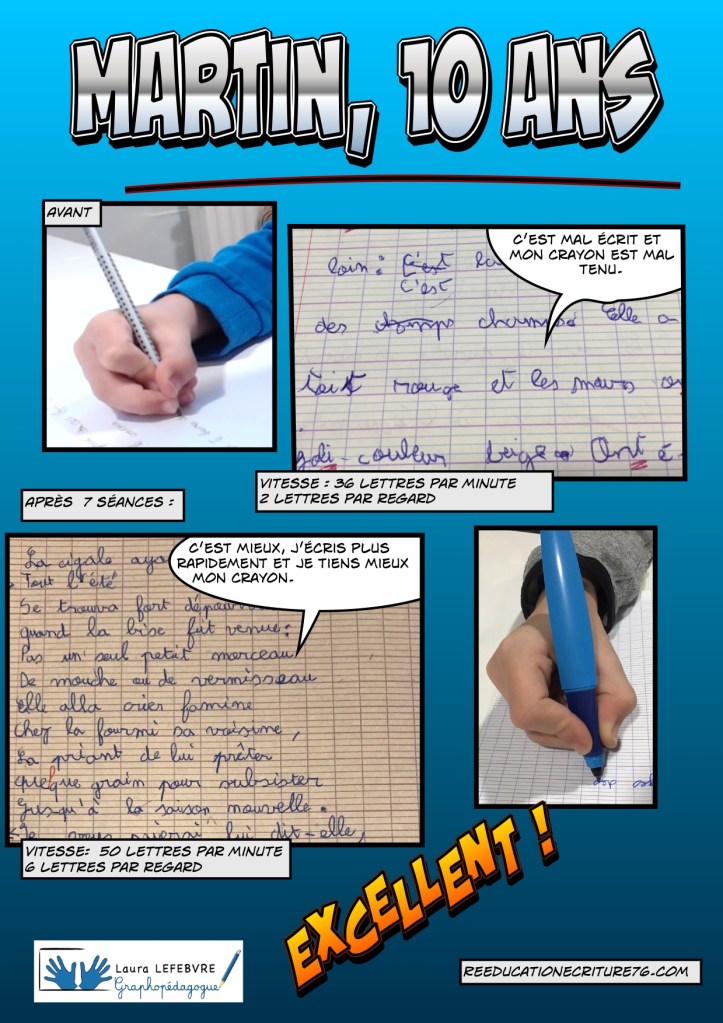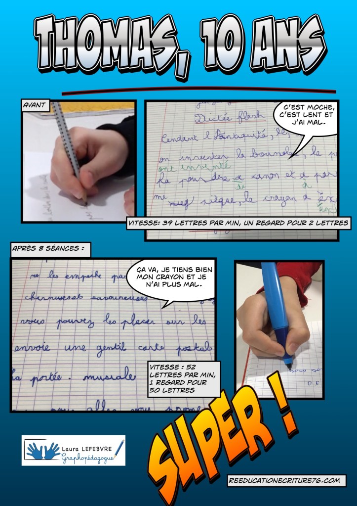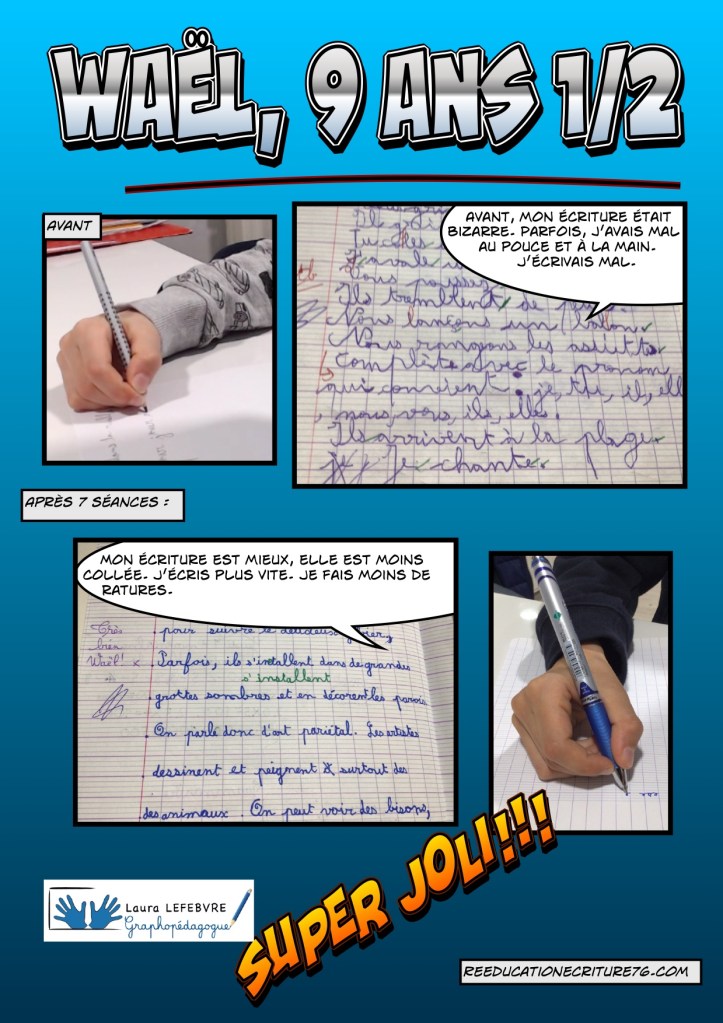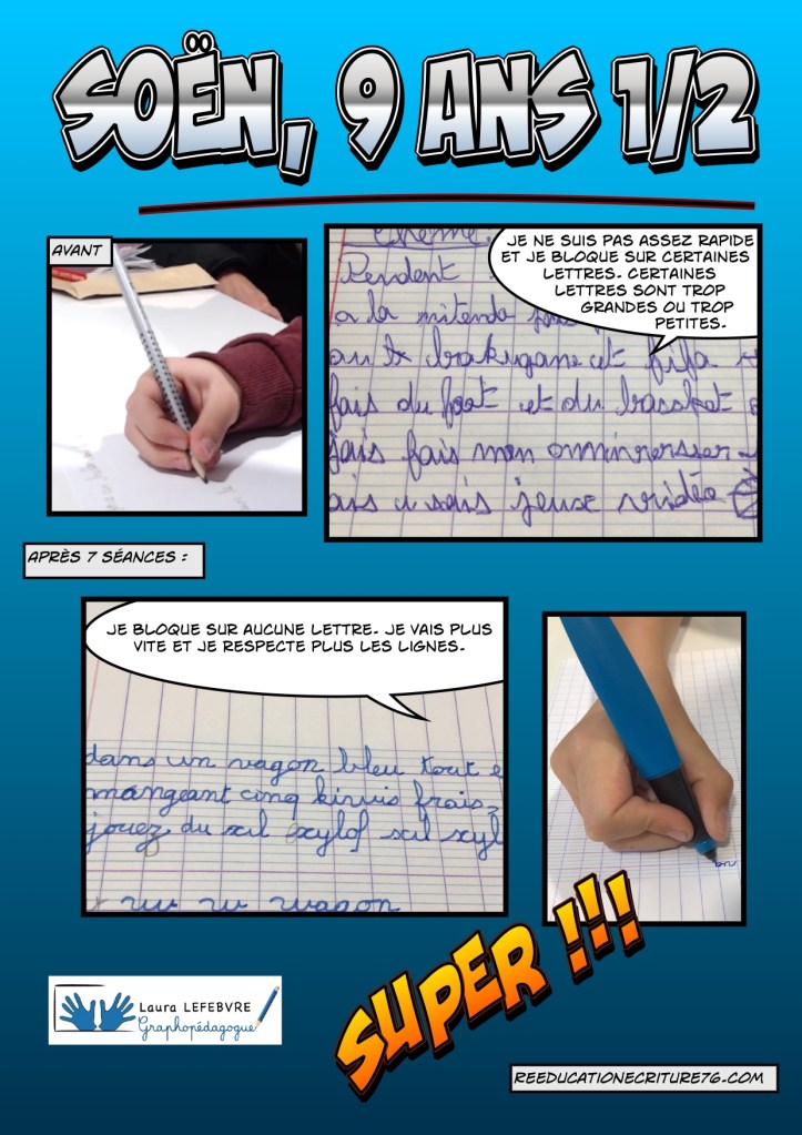 Le souhait d’Évan, écrire sans douleurs, vite et bien. Bravo, tu peux être fier de toi pour ces beaux changements ! Je te félicite également pour ton travail et ton sérieux, c’était un plaisir de travailler à tes côtés.
