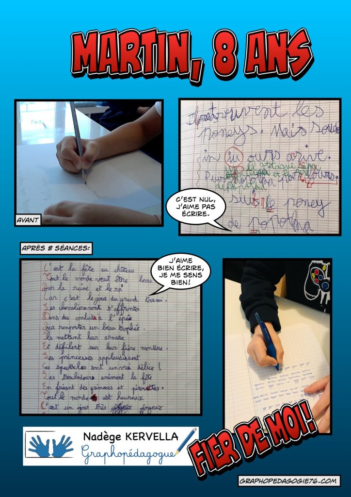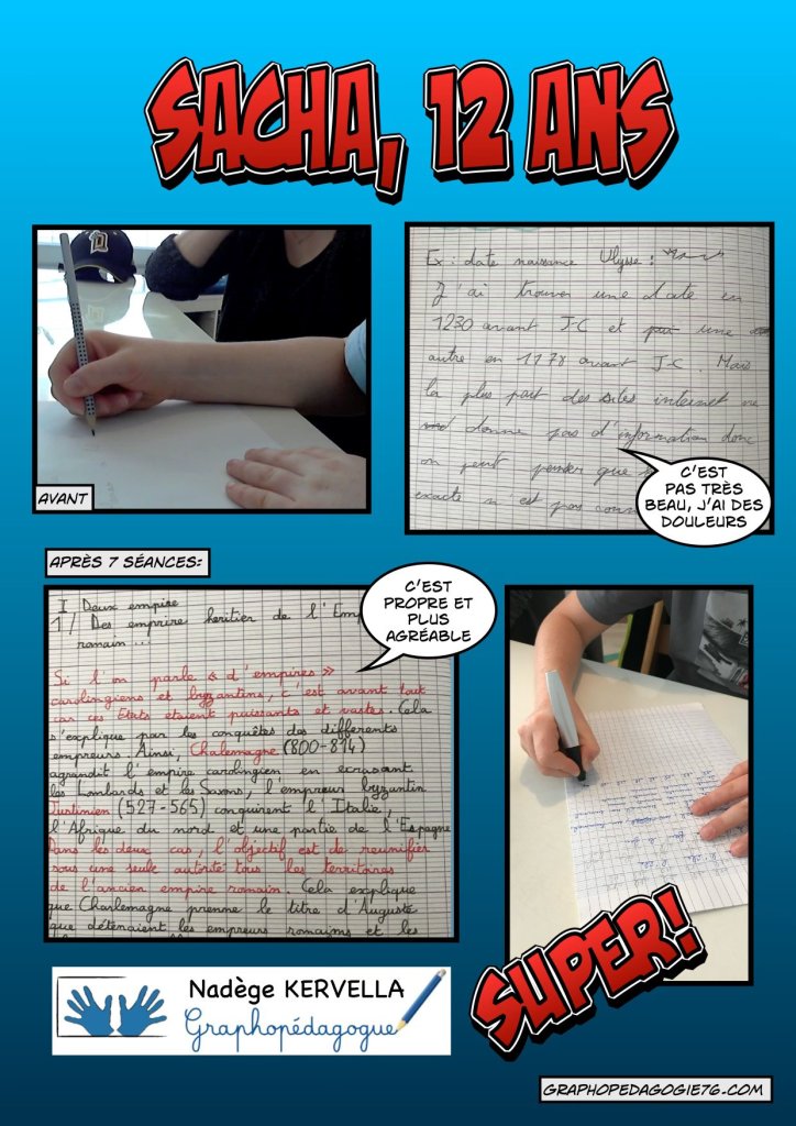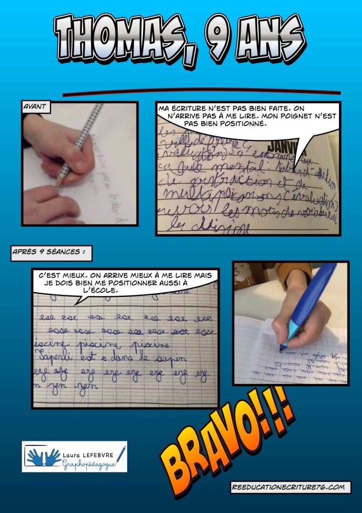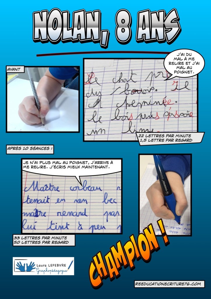 Nathan est venu sans avoir envie de changer quoi que ce soit, même s’il reconnaît avoir quelques fois mal au poignet et n’être pas toujours lisible. Pris au jeu, il s’investit et de bonnes habitudes s’installent. Je te félicite pour ton travail et tes progrès rapides : Bravo !