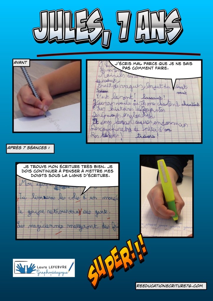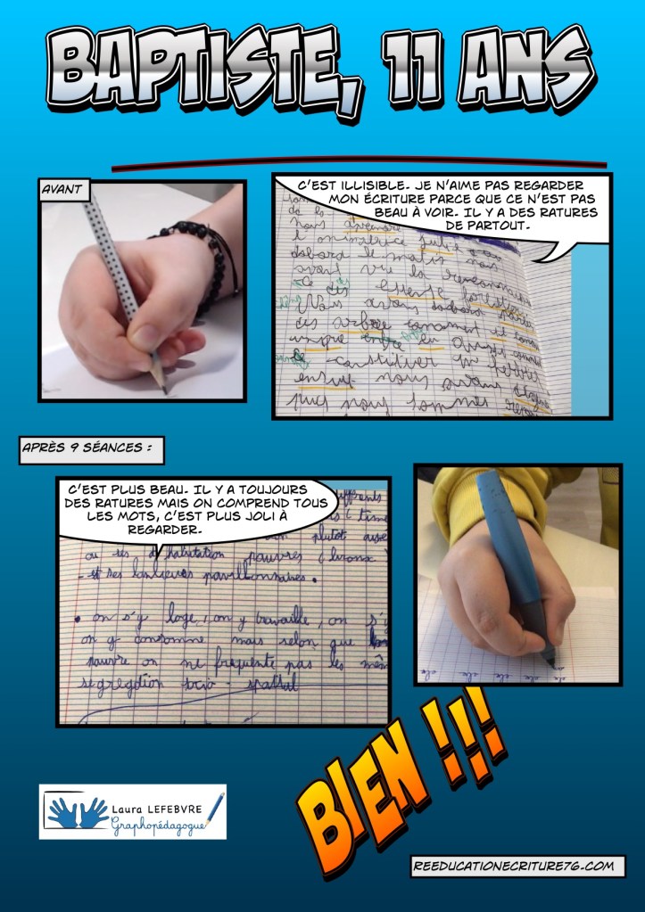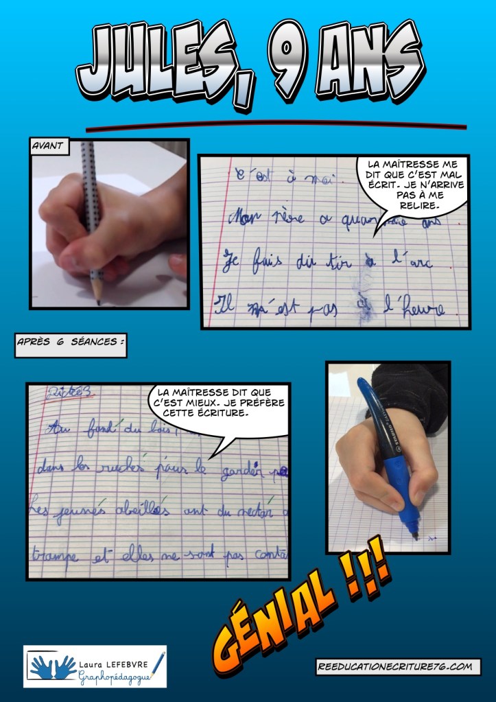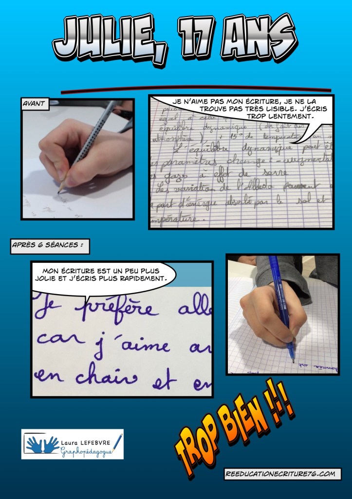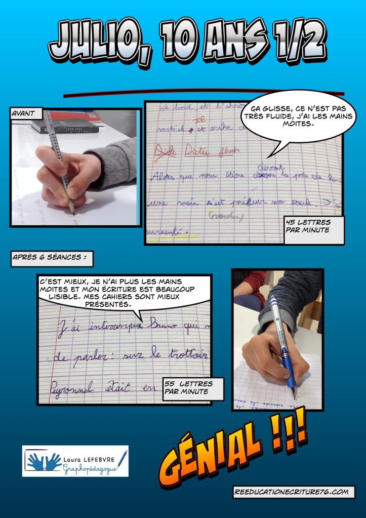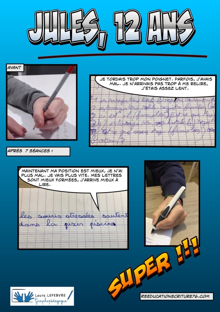La rééducation d’écriture de Julien touche à sa fin, juste avant l’épreuve de bac de français. Plus de remarques des professeurs, Julien est capable de rendre une copie agréable à lire. Il ne faudrait surtout pas que les correcteurs aient du mal à accéder au sens à cause de la forme. Bonne chance Julien pour ton épreuve!