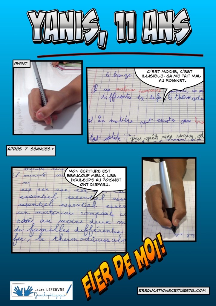 Félicitations Ilyès, tes efforts et ton travail sont récompensés. Tu es maintenant plus lisible et sans douleur, tu peux être fier de toi ! Bravo !