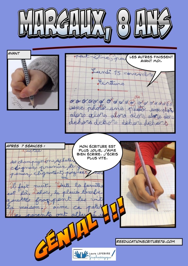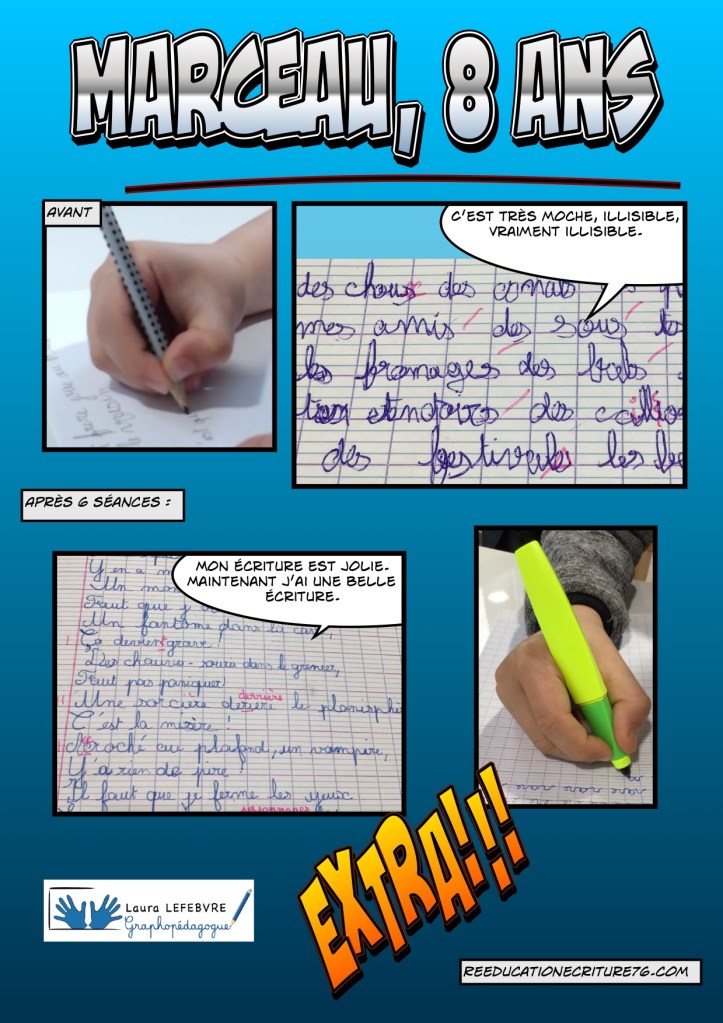 Morgan a terminé aujourd’hui sa rééducation de l’écriture. Son écriture est fluide, ses stratégies de copie sont plus qu’efficaces. Morgan sait maintenant qu’il est capable de réaliser tous les travaux écrits en classe. Bonne continuation Morgan, ta bonne humeur et ton humour vont me manquer.