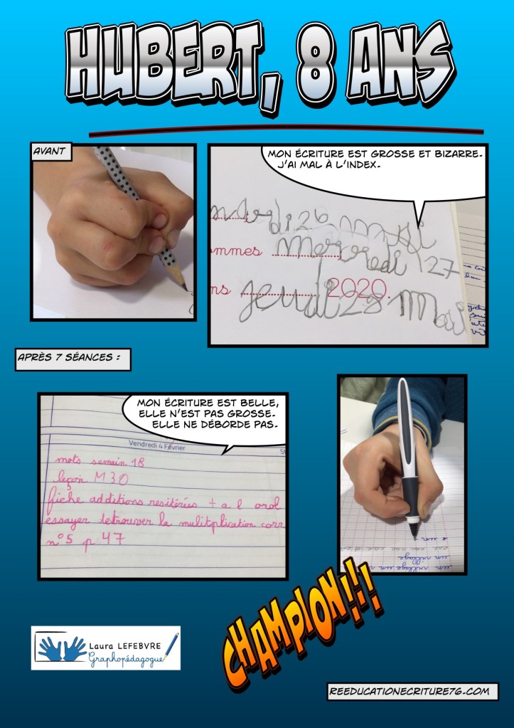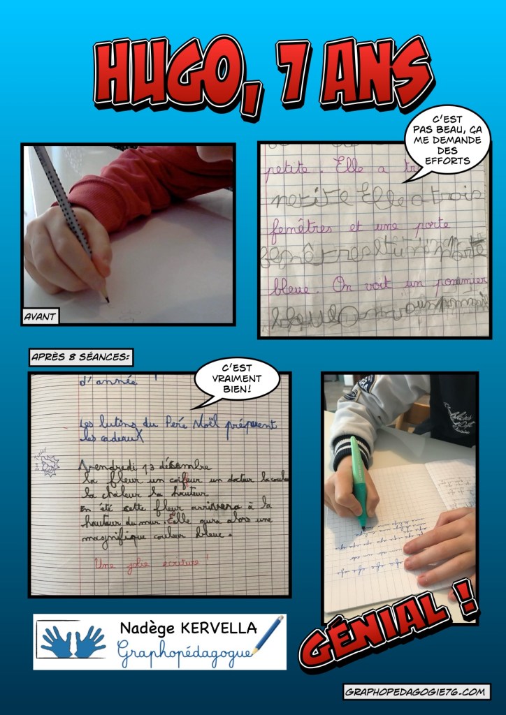 L’exercice de l’écriture était une épreuve pour Hugo. La tâche était coûteuse et sans plaisir. Aujourd’hui, grâce à ton courage et ton travail régulier, tu peux voir le chemin parcouru. Bravo à toi et continue à mettre en pratique tout ce que tu as appris.