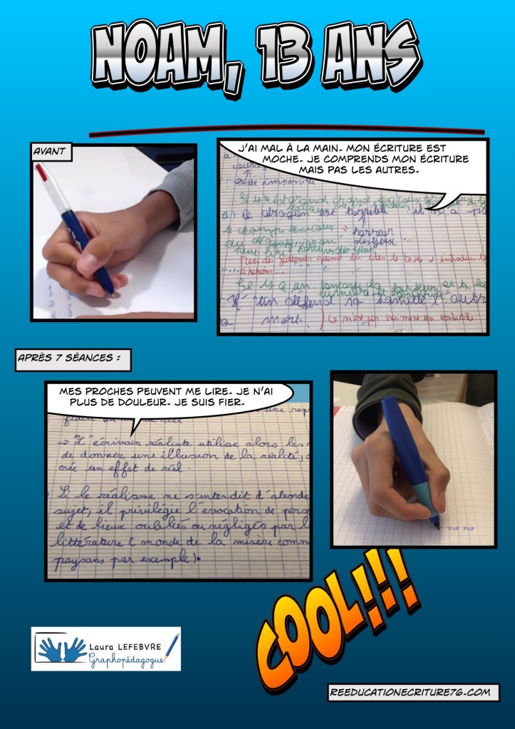 Noé ne prenait aucun plaisir à écrire, bien au contraire. Il n’a pas pris plaisir non plus à venir aux séances de rééducation. Mais grâce à la ténacité et au soutien de sa maman qui a su l’encourager et l’accompagner, Noé a pu faire face à ses difficultés accentuées par sa dyspraxie, son TDAH, son HPI. Il peut être fier de ses énormes progrès accomplis.