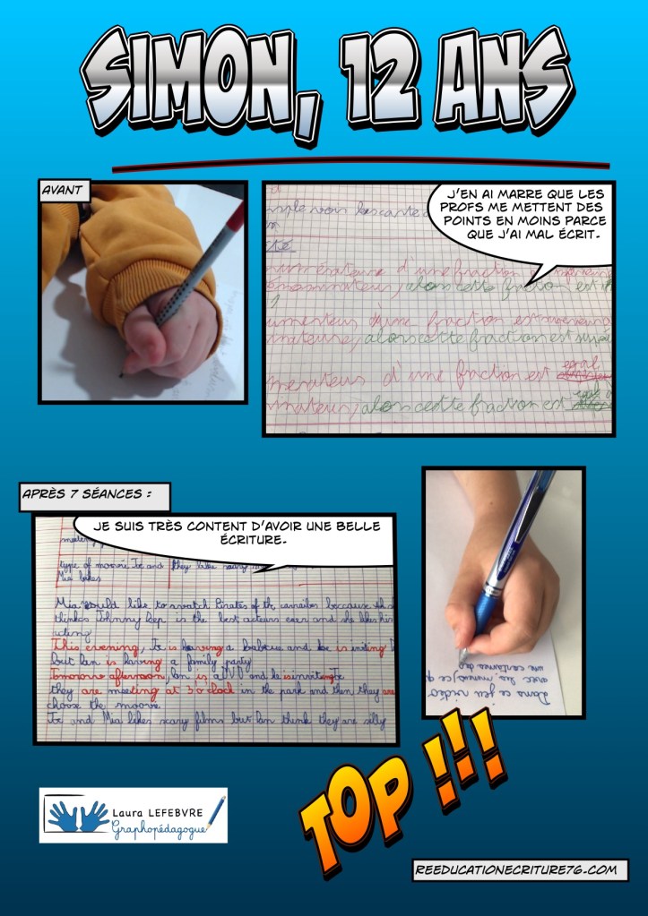 Trio gagnant pour Simon qui a progressé en lisibilité, en vitesse et en stratégies de copie. Il peut maintenant se relire sans difficultés et ses amis et sa famille n’ont plus de mal à le comprendre. En effet, tu as le droit d’être fier de toi, Simon!