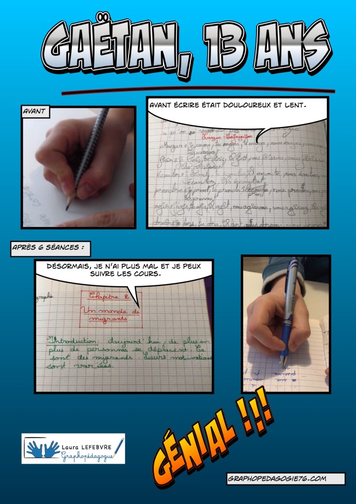 Pour César, écrire était douloureux et laborieux pour un résultat peu satisfaisant. Alléger les appuis, positionner correctement sa main, choisir un stylo adapté et travailler le geste d’écriture, la formation des lettres lui ont permis d’oublier les douleurs, d’aller au bout de ses exercices.