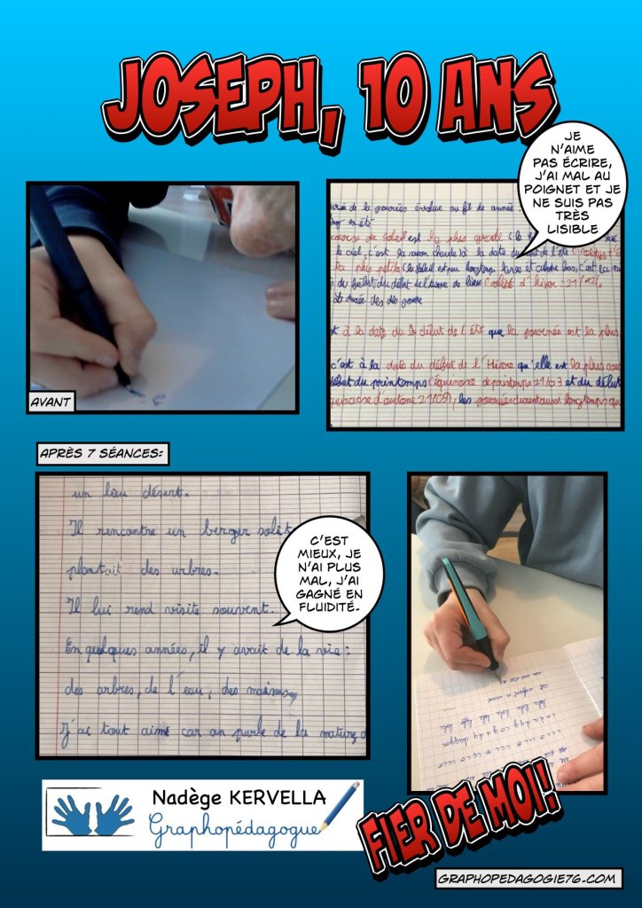 Bravo Joseph, te voilà prêt pour la sixième ! Grâce à ton travail, au revoir douleur, illisibilité et lenteur. Tu peux être fier de toi. Merci pour ta bonne humeur, ça a été un plaisir de t’accompagner. Bonne continuation !
