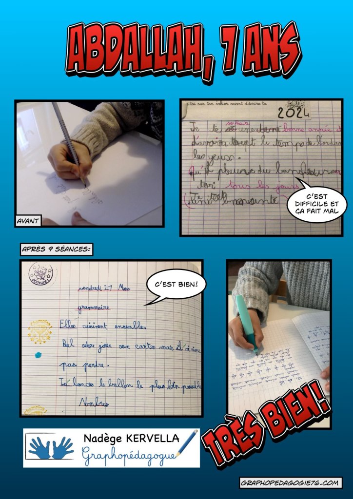 Écrire était vraiment difficile pour Abdallah. Son souhait en venant au cabinet : écrire plus vite, plus joli et sans douleurs. C’est chose faite ! Bravo pour ton excellent travail, tu mérites ces beaux changements, je suis fière de toi !