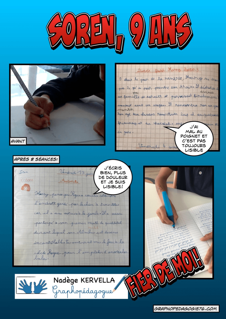 Bravo Soren, tu peux être fier de toi ! En travaillant sur ta posture, ta tenue de crayon, ta fluidité, tu n’as plus de douleurs et on obtient un résultat sans appel : félicitations !