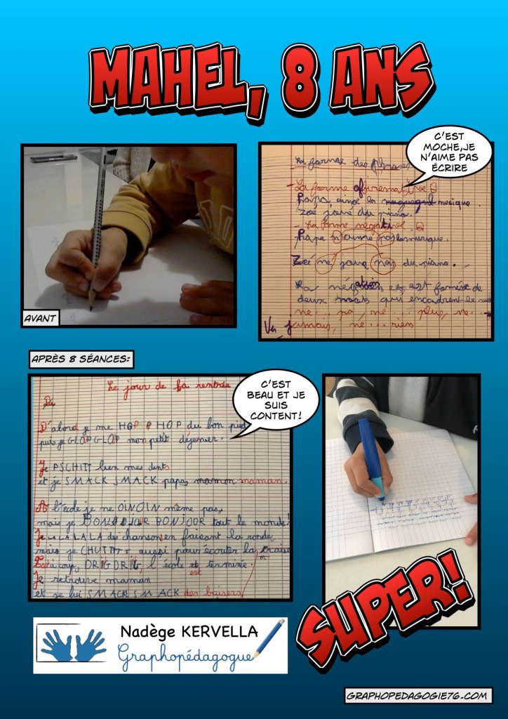 Mahel ne voulait pas se mettre à l’écriture. L’exercice était douloureux, sans plaisir et peu soigné. Après plusieurs séances et du travail, Mahel a dépassé ses peurs et a su appliquer les conseils. Bravo pour ta détermination et n’oublie pas que tu sais faire, Félicitations !