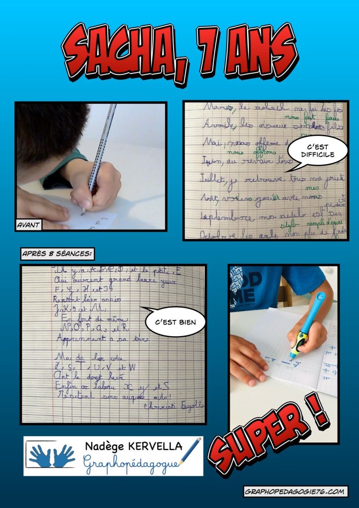 En grandissant, Sacha a pu constater les freins liés à une mauvaise tenue de crayon, une mauvaise posture. Il a repoussé la porte du cabinet, motivé cette fois. Et c’est bien là la clé qui lui a permis de progresser avec mon aide puis avec celle de Nadège Kervella